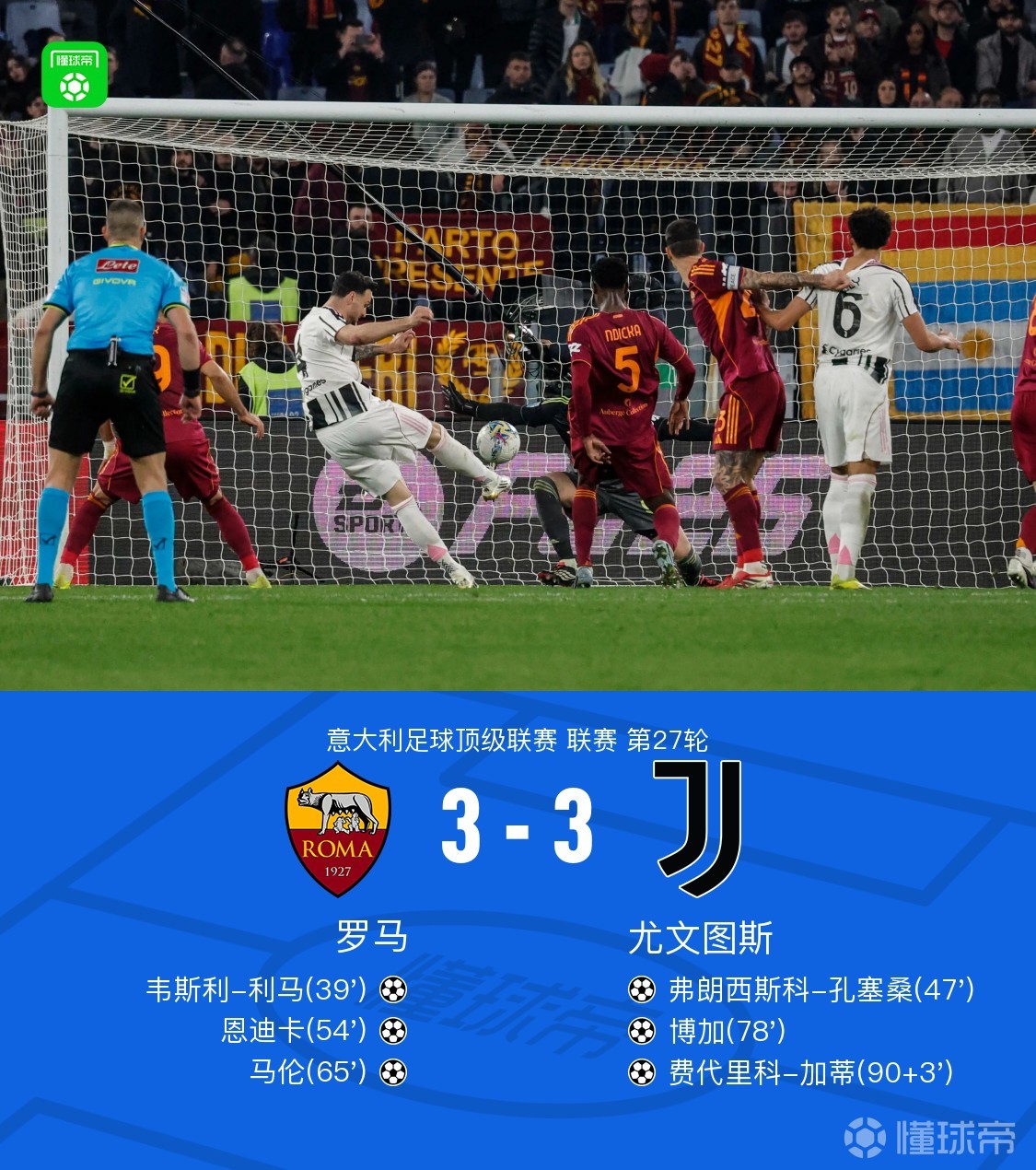 北京时间3月2日意大利足球顶级联赛第27轮,罗马主场迎战尤文图斯。上半场韦斯利兜射世界波破门,下半场孔塞桑世界波回应扳平,恩迪卡垫射得分,马伦单刀建功,博加抽射扳回一球,加蒂绝平。最终双方战成3-3平。点击查看本场比赛详细数据>>点击查看意甲完整积分榜>>关键事件第39分钟,韦斯利左路内切兜射远角破门,罗马1-0尤文第48分钟,孔塞桑禁区外凌空抽射世界波破门,尤文1-1扳平